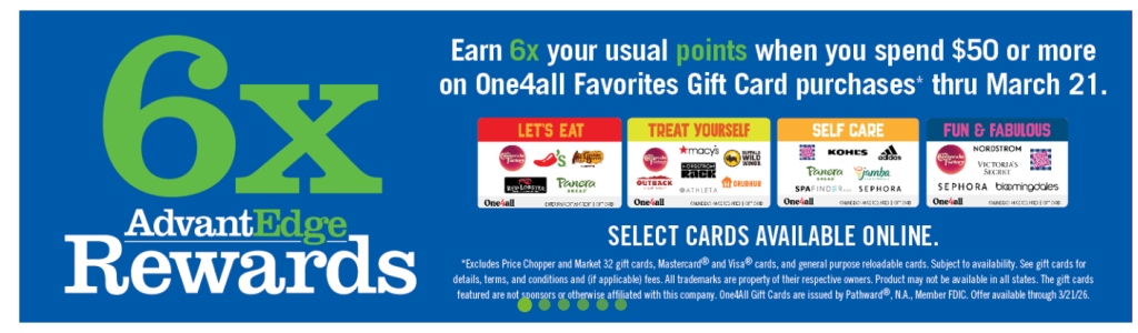 Price Chopper: Earn 6X AdvantEdge Rewards when you spend $50 on select gift card purchases: