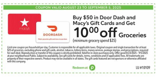 Buy $50 in the following gift cards and get $10 off groceries (minimum grocery spend $25)