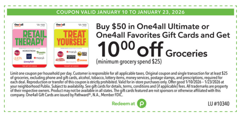 Buy $50 in One4All gift cards and get $10 off groceries (minimum grocery spend $25)