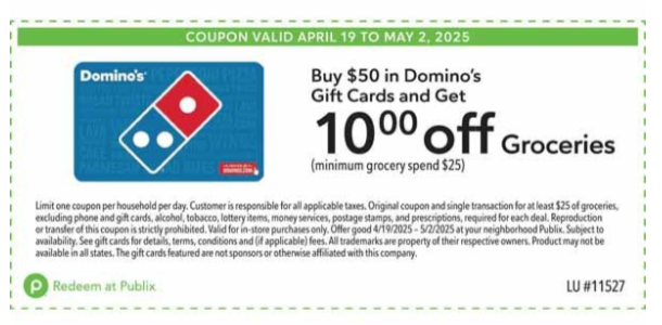 Buy $50 in Domino’s gift cards and get $10 off groceries (minimum grocery spend $25)