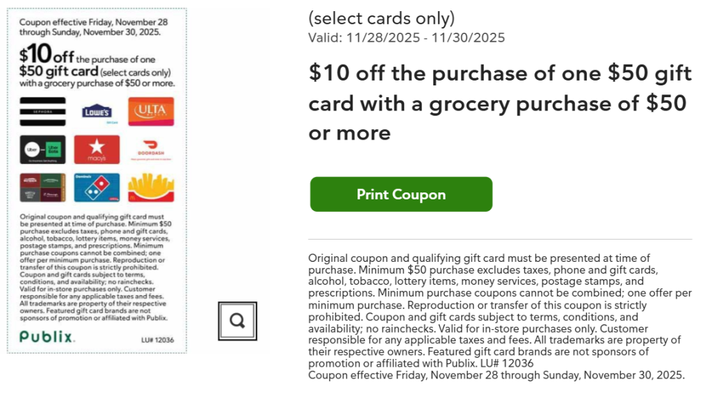 Buy $50 in the following gift cards and get $10 off groceries (minimum grocery spend $25):