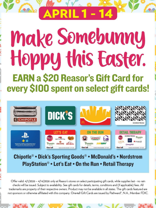 Reasor’s: Buy $100 Chipotle, Dick’s McDonald’s, Nordstrom, PlayStation, Let’s Eat, On The Run or Retail Therapy Gift Cards And Get a $20 Reasor’s Gift Card Free