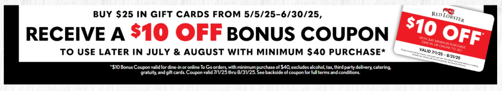 Buy $25 in gift cards and receive a $10 off bonus coupon to use later in July & August with minimum $40 purchase