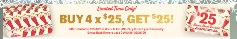 Receive a $25 bonus buck reward for every $100 (or receive a $10 bonus buck reward for every $50) in egift and plastic gift card purchases made online