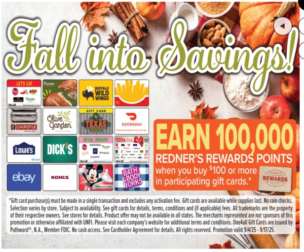 Earn 100,000 Redner’s Rewards points (worth $10 in groceries) when you buy $100 of more in the following gift cards: