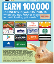 Earn 100,000 Redner’s Rewards points (worth $10 in groceries) when you buy $100 of more in the following gift cards: