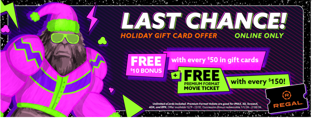 Get a FREE $5 concessions bonus with every $25 in gift cards, including Regal Unlimited eCards. Get an EXTRA $5 bonus with every $100! That’s $25 in concession bonus that expires in September, for every $100 purchased.