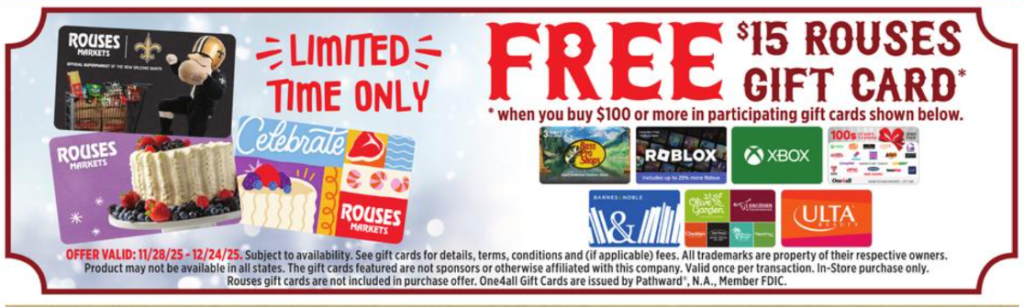 Free $15 Rouses gift card when you buy $100 or more in the following gift cards: