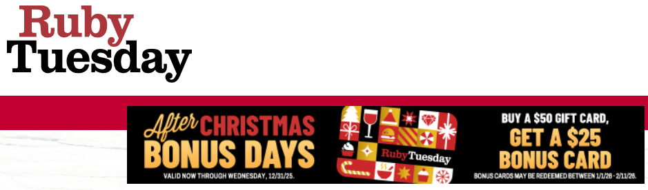 Buy $50 Ruby Tuesday Gift Card and Get a $25 Bonus Card Free