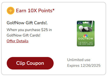 - Earn 10X points on $25 GolfNow gift cards