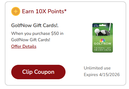- Earn 10X points on $50 GolfNow gift cards