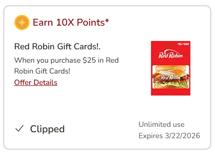 Earn 10x Points when you purchase $25 in Red Robin gift cards.