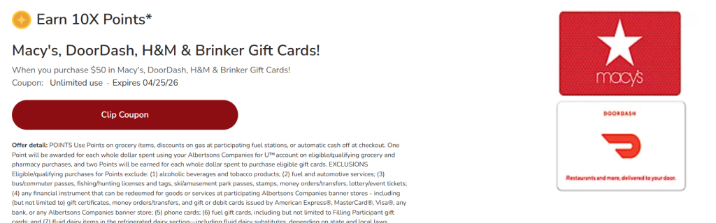 Earn 10X Points when you purchase $50 in the following gift cards: