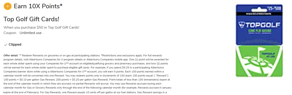 Earn 10x Points when you purchase $50 in Topgolf gift cards