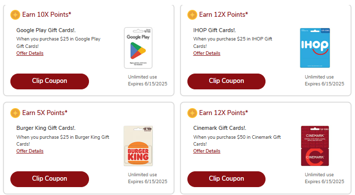 Earn 10x Points on the following gift cards: