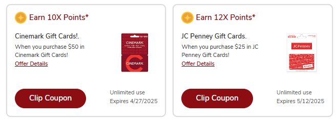 Earn 12x Points on $25 JCPenney Gift Cards and 10X Points on $50 Cinemark Gift Cards
