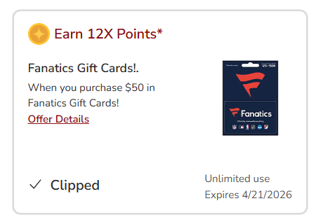 - 12x points for $50 Fanatics