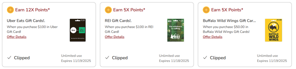 [EXPIRED] Safeway/Albertsons/Vons/Jewel-Osco/ACME: Earn 12X Points on Uber Gift Cards | Earn 5X Point on REI and Buffalo Wild Wings Gift Cards