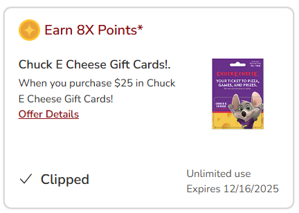 - Earn8x Points on $25 Chuck E. Cheese Gift Cards