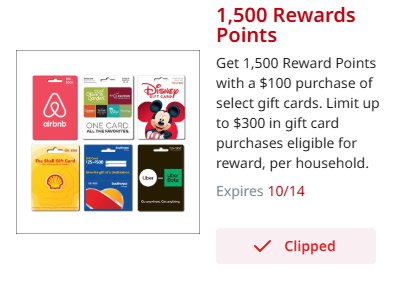Get 1,500 Reward Points with a $100 purchase of the following gift cards: