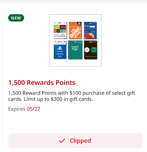 Get 1500 Reward Points with a $100 purchase of the following gift cards: