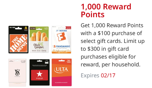 • Limit up to $300 in gift card purchases eligible for reward, per household