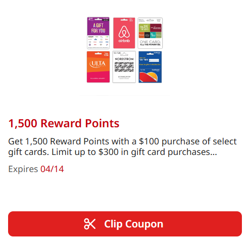 Get 1500 Reward Points with a $100 purchase of the following gift cards:
