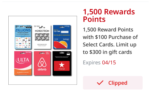Get 1500 Reward Points with a $100 purchase of the following gift cards: