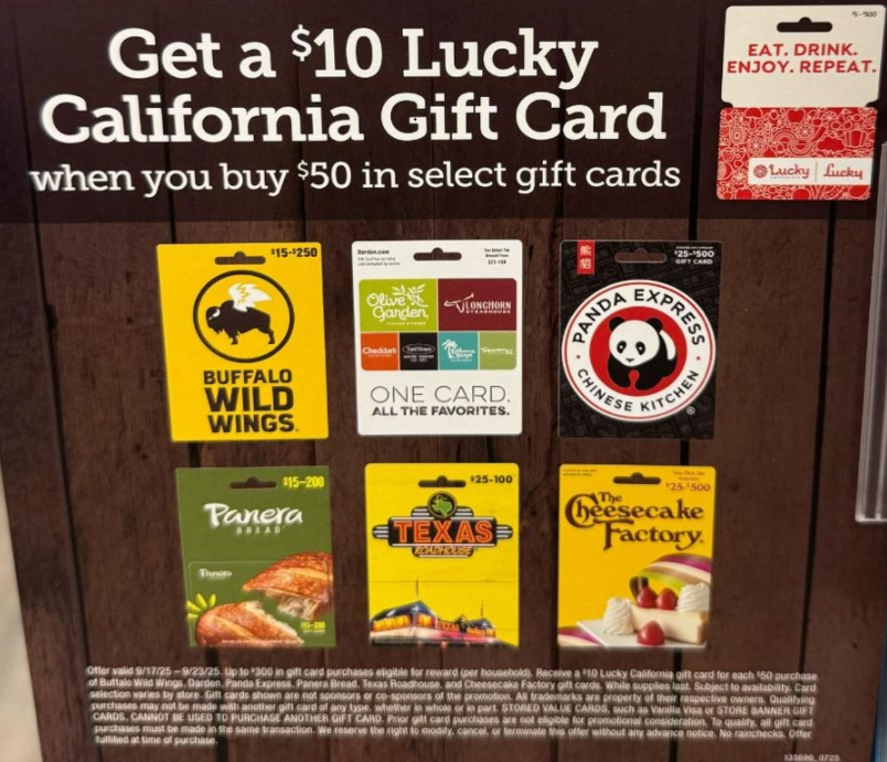 Get a $10 store gift card (i.e. those buying at a Save Mart locations will receive a $10 Save Mart gift card, etc.) for each $50 purchased in the following gift cards: