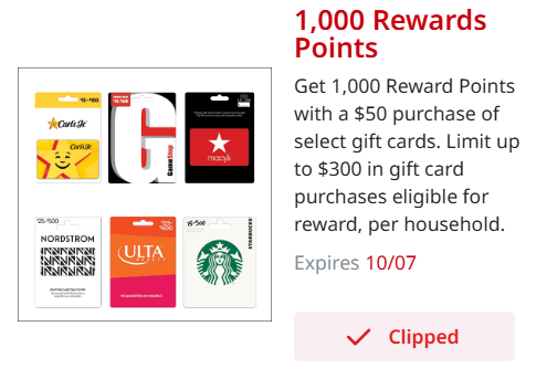Get 1,000 Reward Points with a $50 purchase of the following gift cards: