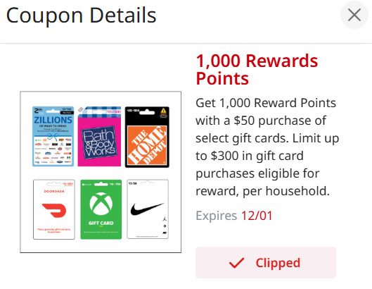 - Limit up to $300 in gift card purchases eligible for reward, per household