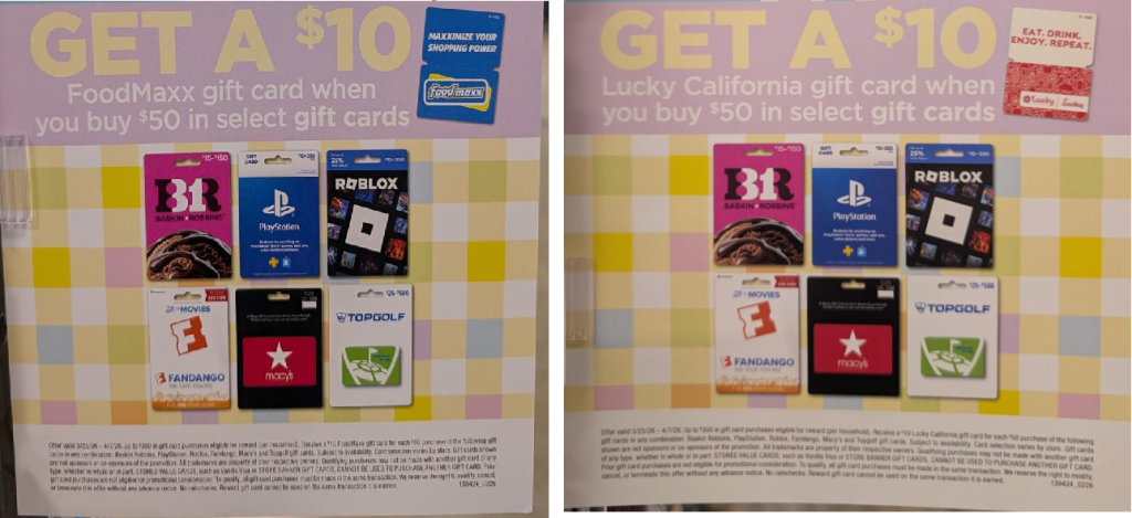 Image is from a Lucky California supermarket, but usually when bonus is a store gift card, SaveMart and FoodMaxx participate in the same promotion. <- Confirmed, this promotion is available at FoodMaxx, as well.