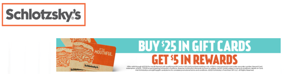- This $5 Reward Code is awarded free with qualifying purchase, is valid for redemption between 11/4/25 and 2/14/26 and may only be used to discount five dollars from purchased goods at participating Schlotzsky’s locations (excluding taxes & fees)