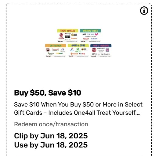 Save $10 when you buy $50 or more in select One4All Gift Cards. Includes the following: