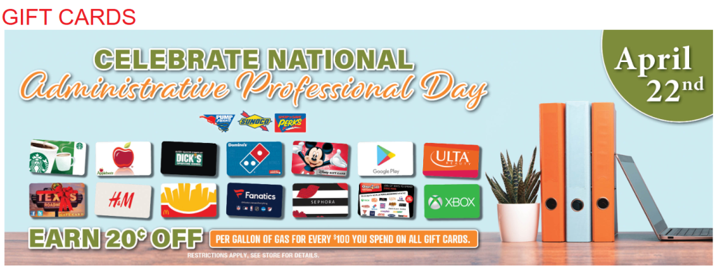If your store has Apple, Best Buy, Lululemon or Neiman Marcus gift cards, these brands probably offer the best value, as long as you can make use of the gas discount. Max fill up with Pump Perks is 30 gallons – if you are able to take advantage of that, you will get 6% off your gift card purchases in the form of fuel savings.