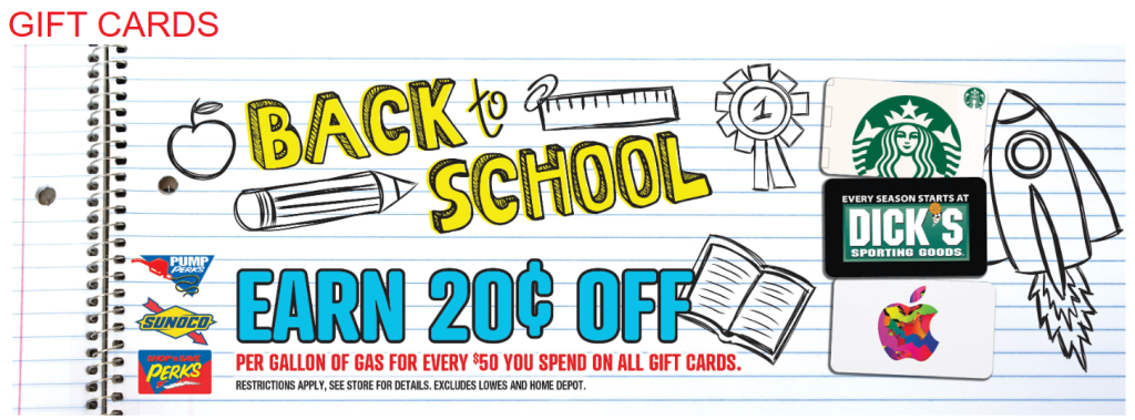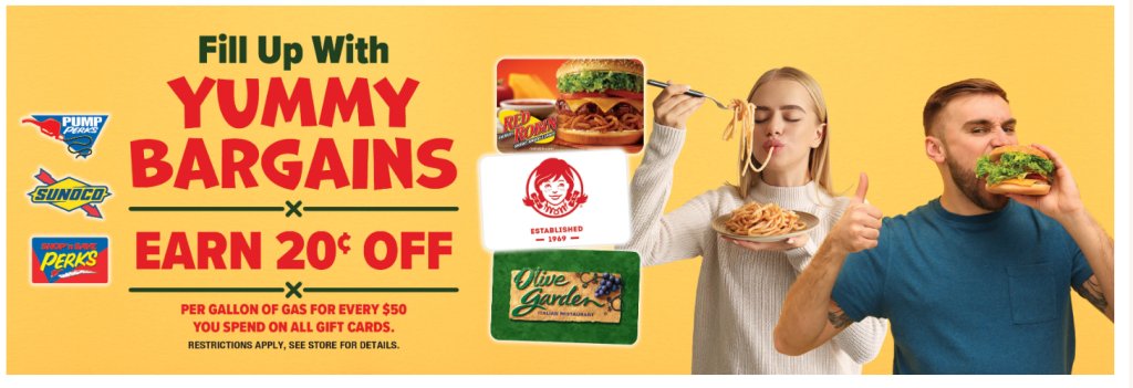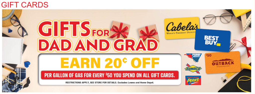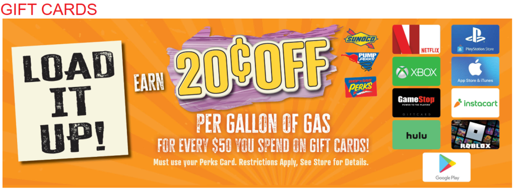 Occasionally, they have a 30c off per gallon deal, with up to 18% of your gift card purchases turning into fuel savings.