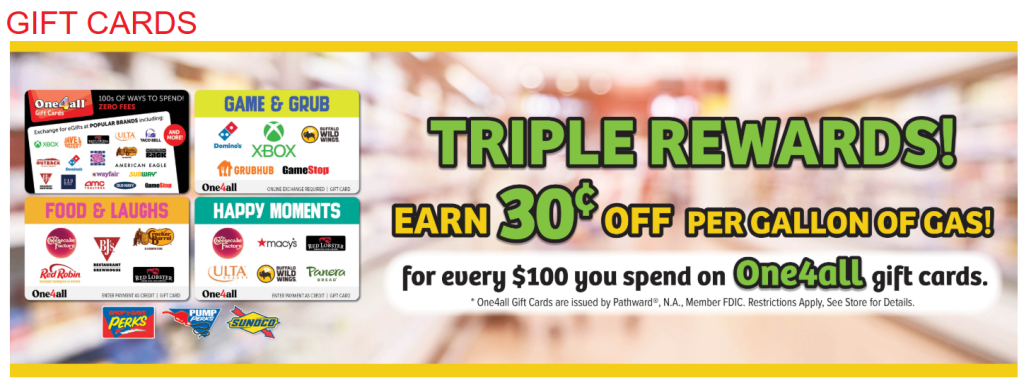 Earn 30c off per gallon for every $100 you spend on One4All gift cards.