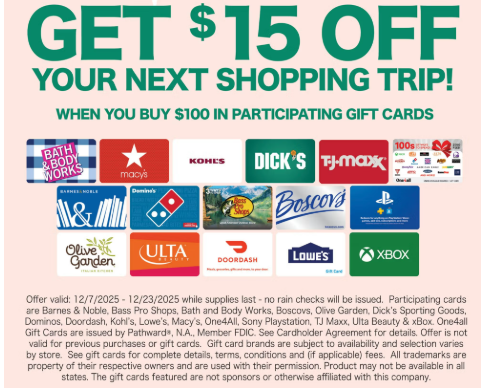 Get $15 Off Your next shopping trip when you buy $100 or more in the following gift cards: