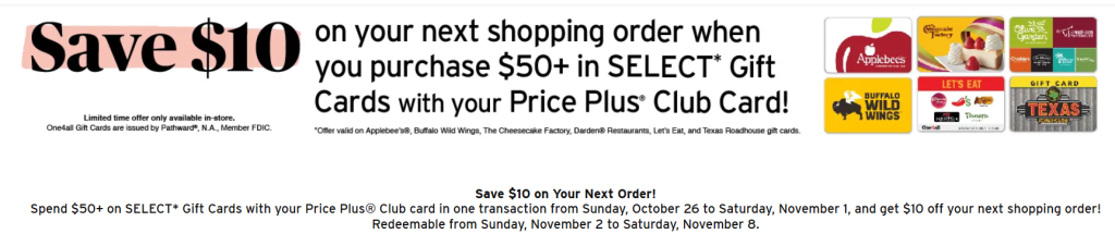 Buy $50 or more in the following gift cards with your Price Plus Club card and get $10 off your next shopping order: