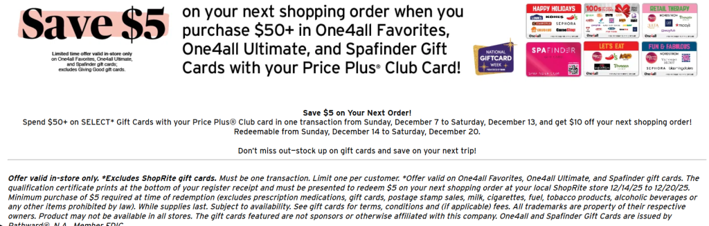 Buy $50 or more in the following gift cards with your Price Plus Club card and get $5 off your next shopping order: