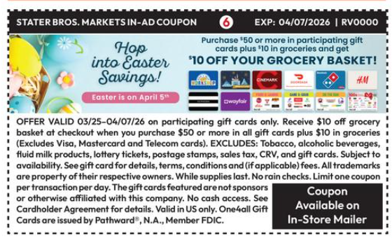 Receive $10 off grocery basket at checkout when you purchase $50 or more in the following gift cards plus $10 in groceries: