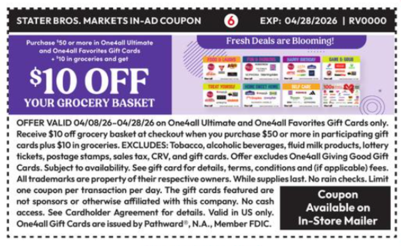 Receive $10 off grocery basket at checkout when you purchase $50 or more in the following gift cards plus $10 in groceries: