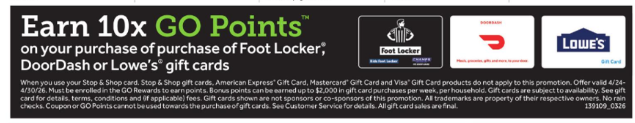 Stop & Shop: 10x GO Rewards Points on Foot Locker, DoorDash and Lowe’s Gift Cards