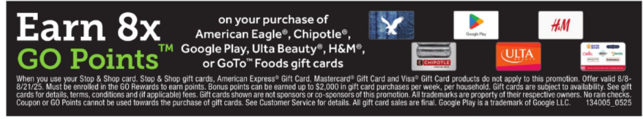 [EXPIRED] Stop & Shop: 8x GO Rewards Points on American Eagle, Chipotle, Google Play, Ulta, H&M and GoTo Foods Gift Cards