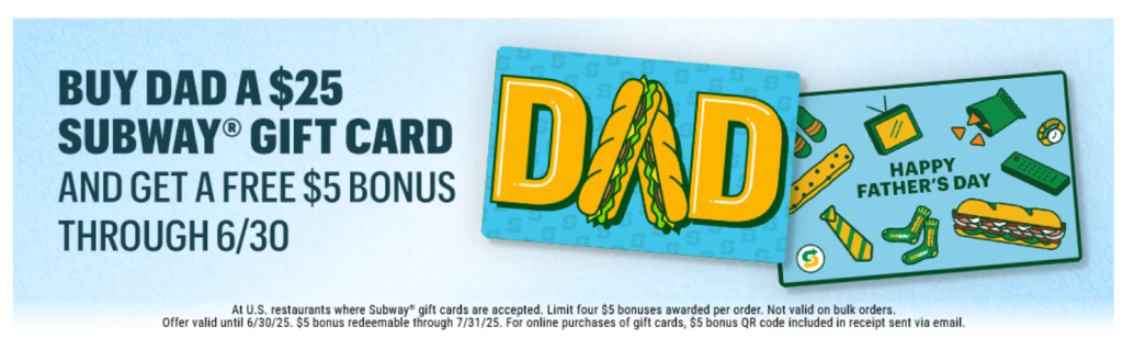 eGift Cards / Physical Gift Cards[EXPIRED] Subway: Buy $25 Store Gift Card and Get a $5 Bonus Cards Free June 8, 2025July 1, 2025 - by GCanywhere Staff - Leave a Comment The Deal Buy a $25 Subway gift card and get a free $5 bonus card Direct link to offer Key Terms Offer valid until June 30, 2025 Limit four $5 bonuses awarded per order $5 bonus card redeemable through 7/31/25 Tips & Ideas