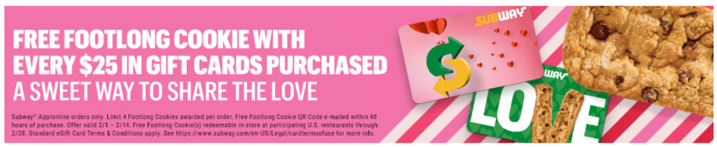 Get a free footlong for every $50 of gift cards you buy in app or online at subway.com