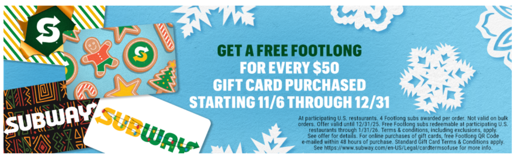 Get a free footlong for every $50 of gift cards you buy in app or online at subway.com