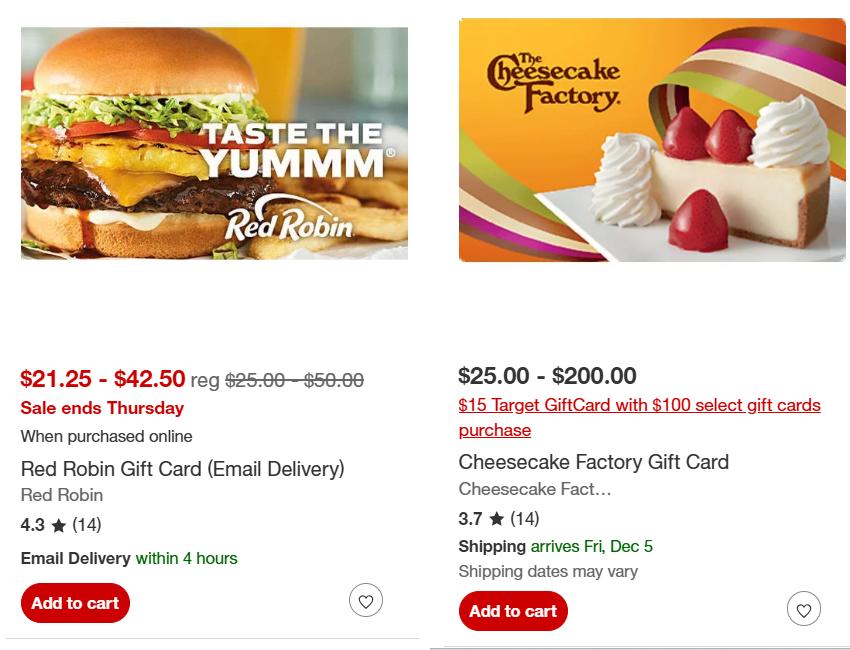[EXPIRED] Target (Online): 15% Off Uber, Xbox and Red Robin Gift Cards | Buy $100 The Cheesecake Factory Gift Cards and Get a $15 Target Gift Card Free (Updated)