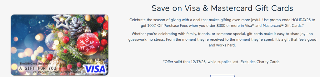 Use promo code HOLIDAY25 to get 100% Off Purchase Fees when you order $300 or more in Visa and Mastercard Gift Cards.