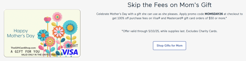 Apply promo code MOMSDAY26 at checkout to get 100% off purchase fees on Visa® and Mastercard® gift card orders of $50 or more.